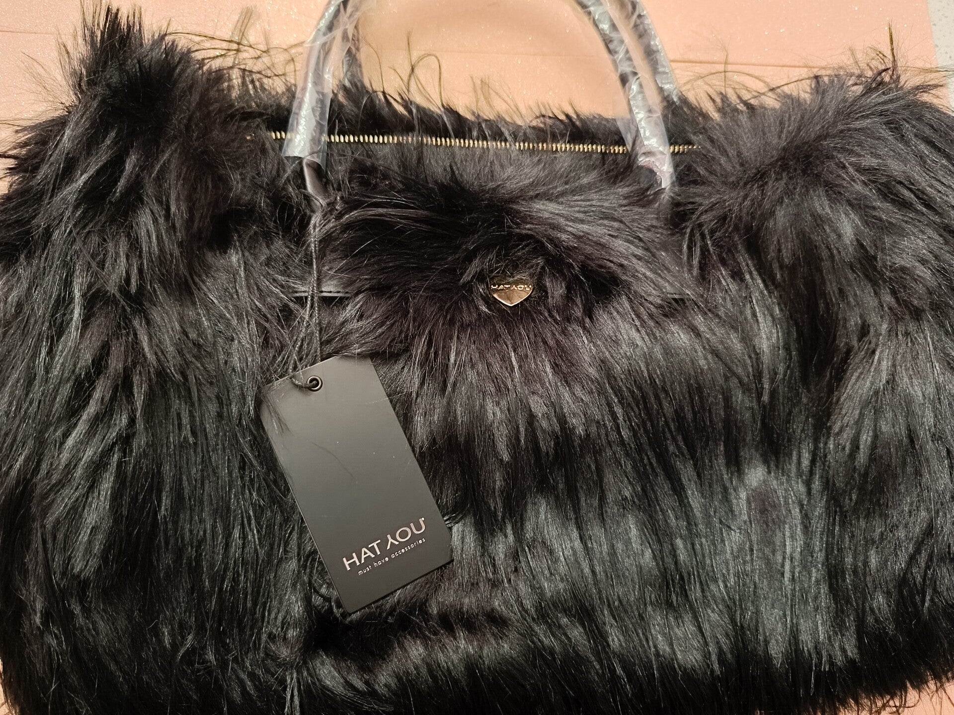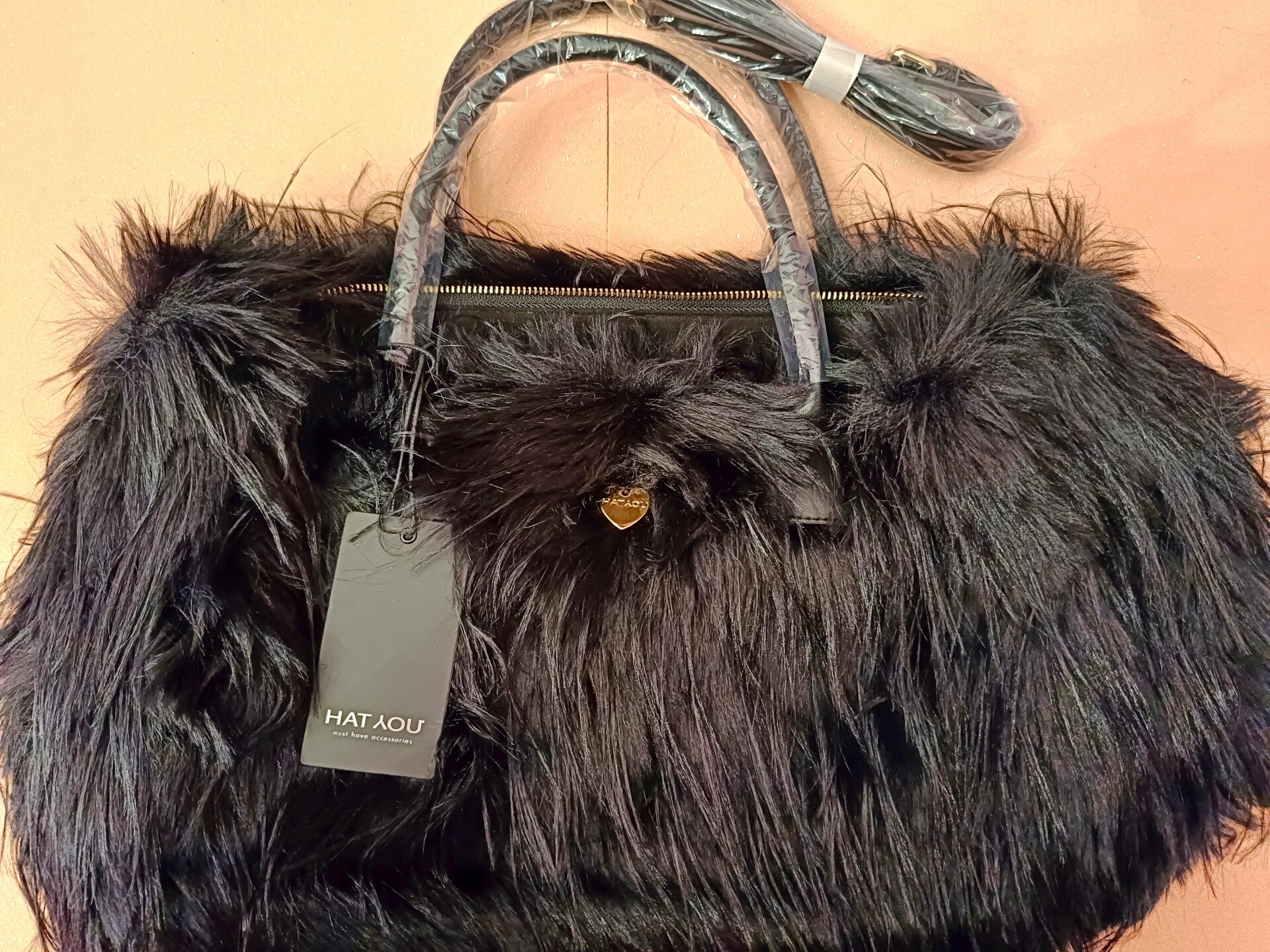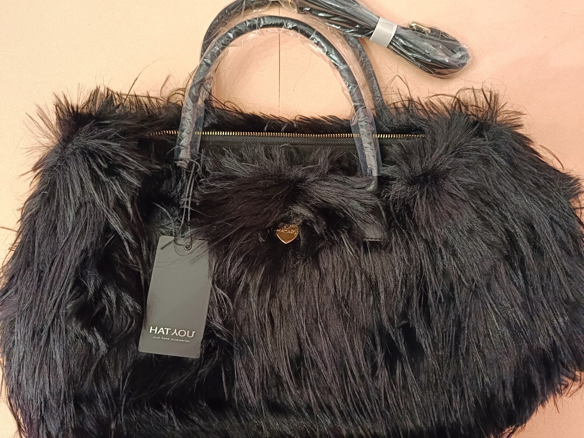 Borsa chic a spalla o tracolla di pelliccia nera con chiusura con cerniera. Questa borsa è impreziosita con un cuore centrale di colore oro.