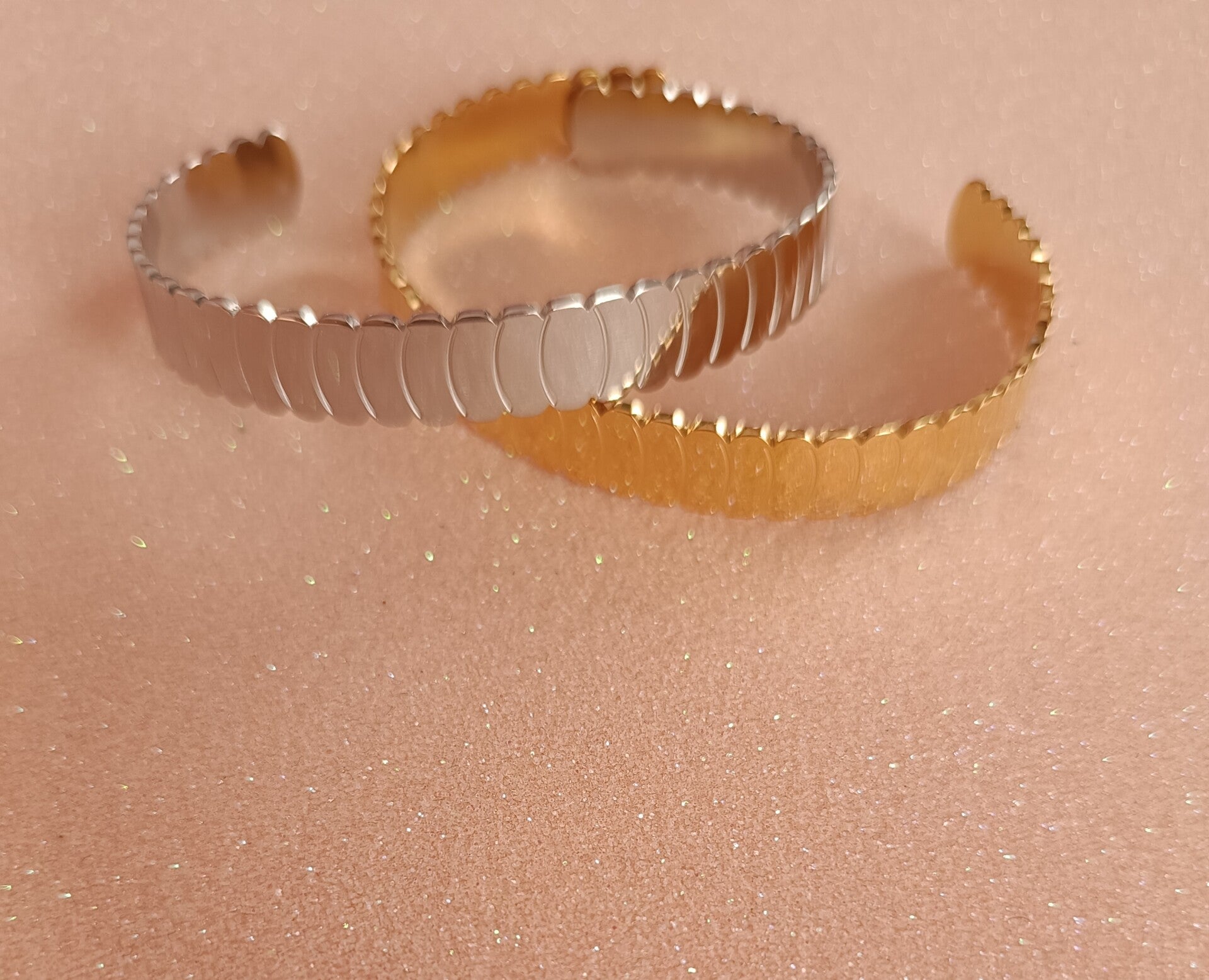 Questo bracciale è rigido ed è placcato in acciaio lucido nella sua semplicità vi darà un look essenziale. Oltre a poterlo avere in questa variante di colore c'è anche oro.