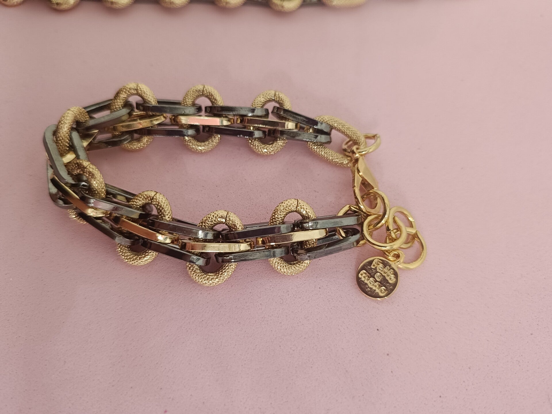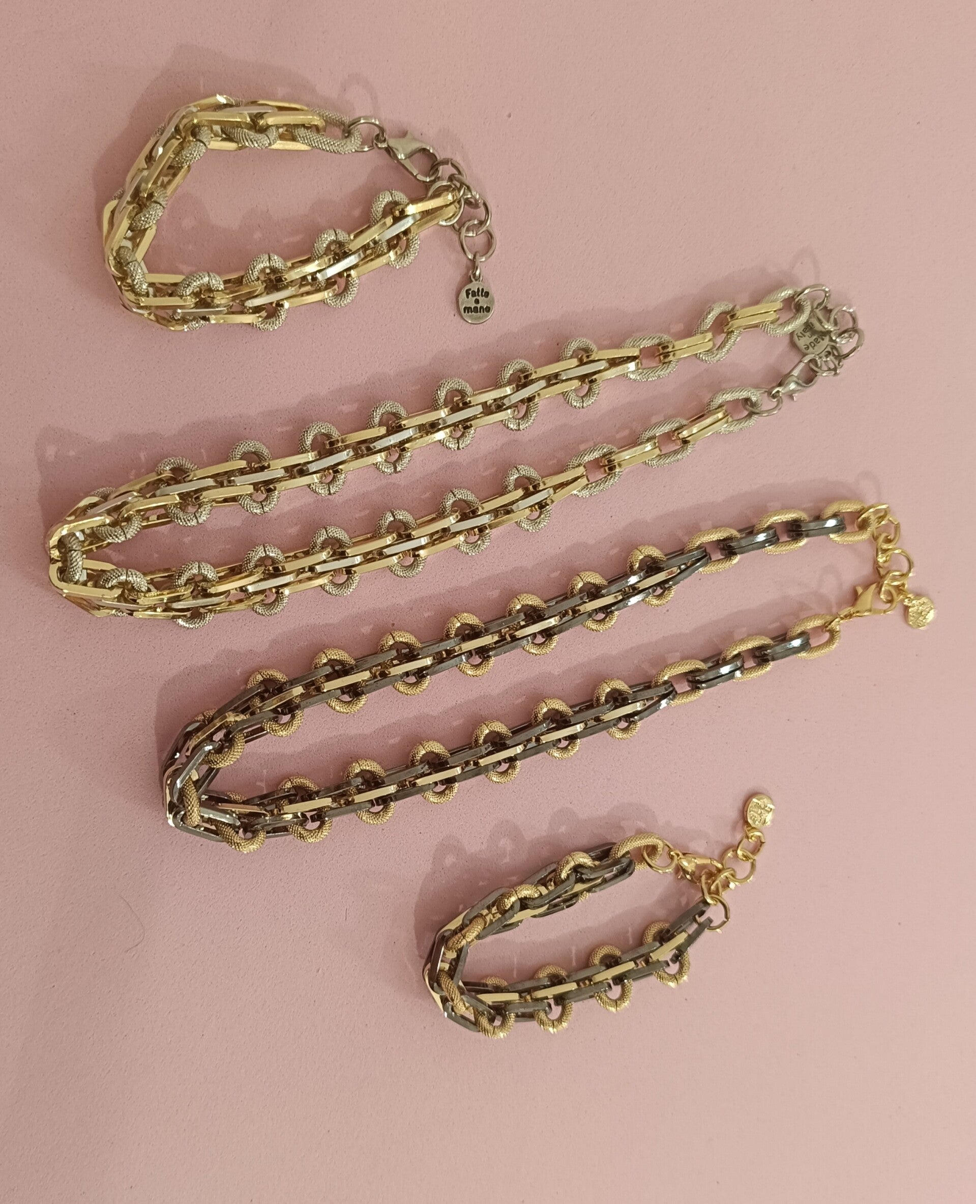 Collana realizzata a mano ed è a catena con una parte in oro e l' altra parte di colore fumé. La particolarità di questa collana e che ha sia delle parte in oro lucido che satinato, sia una parte lucida placcata fumé. In coordinato si può acquistare anche il bracciale. Questo articolo si può avere anche nella variante oro lucido con la parte satinata di colore silver.