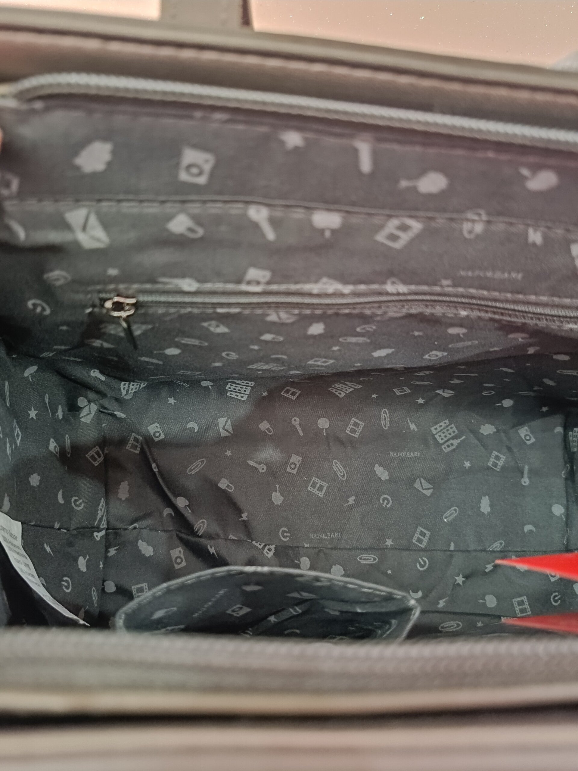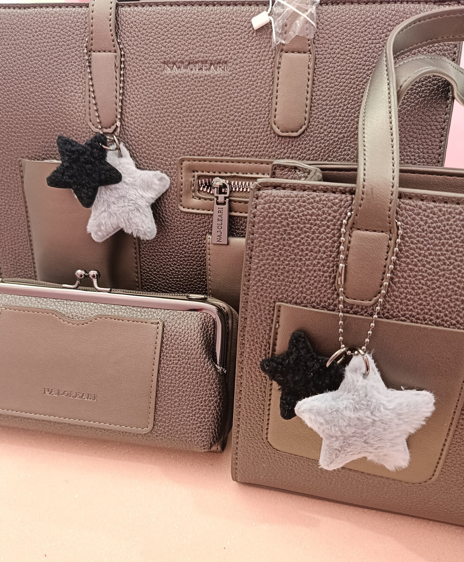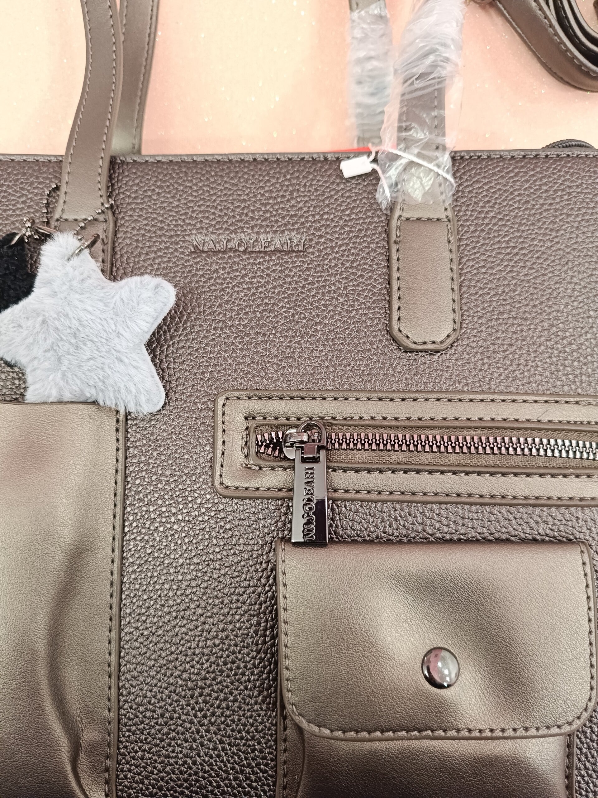 Borsa da donna capiente ma allo stesso tempo glamour.È di colore cangiante che la rende particolare, inoltre ci sono dei charms con le stelle in pelliccia ed è adornata da vari taschini. È possibile acquistarla sia singolarmente che l'intera linea per essere sempre pronte in base alle vostre occasioni.Della stessa linea c'è la versione in total black come potete osservare dall' immagine.