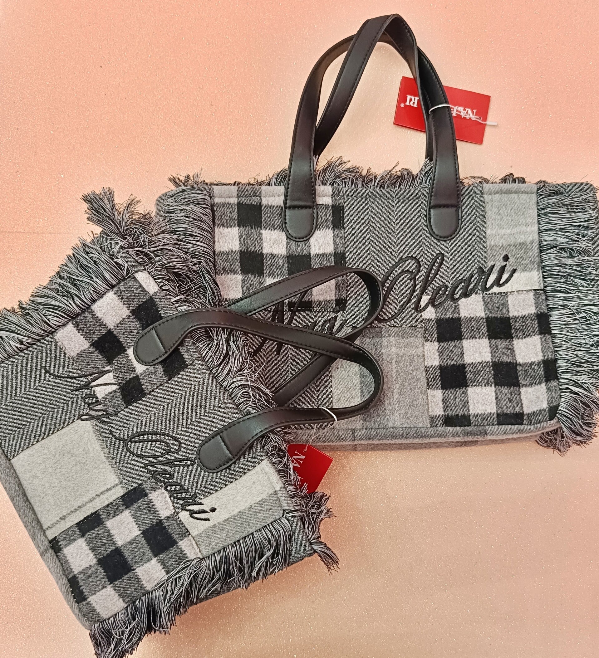 Borsa di dimensioni M con stampa scozzese con dei giochi di colore alternati dal nero, al grigio, al bianco.È rifinita con delle frange che riportano gli stessi colori della stampa rendendola particolare e trendy.È dotata anche della tracolla e si puó acquistare sia singolarmente che l' intero set in modo tale da avere dei pezzi unici che possono essere sempre utili per diverse occasioni. Della stessa linea ci sono altre varianti di colore: il verde, il fucsia e il blu.