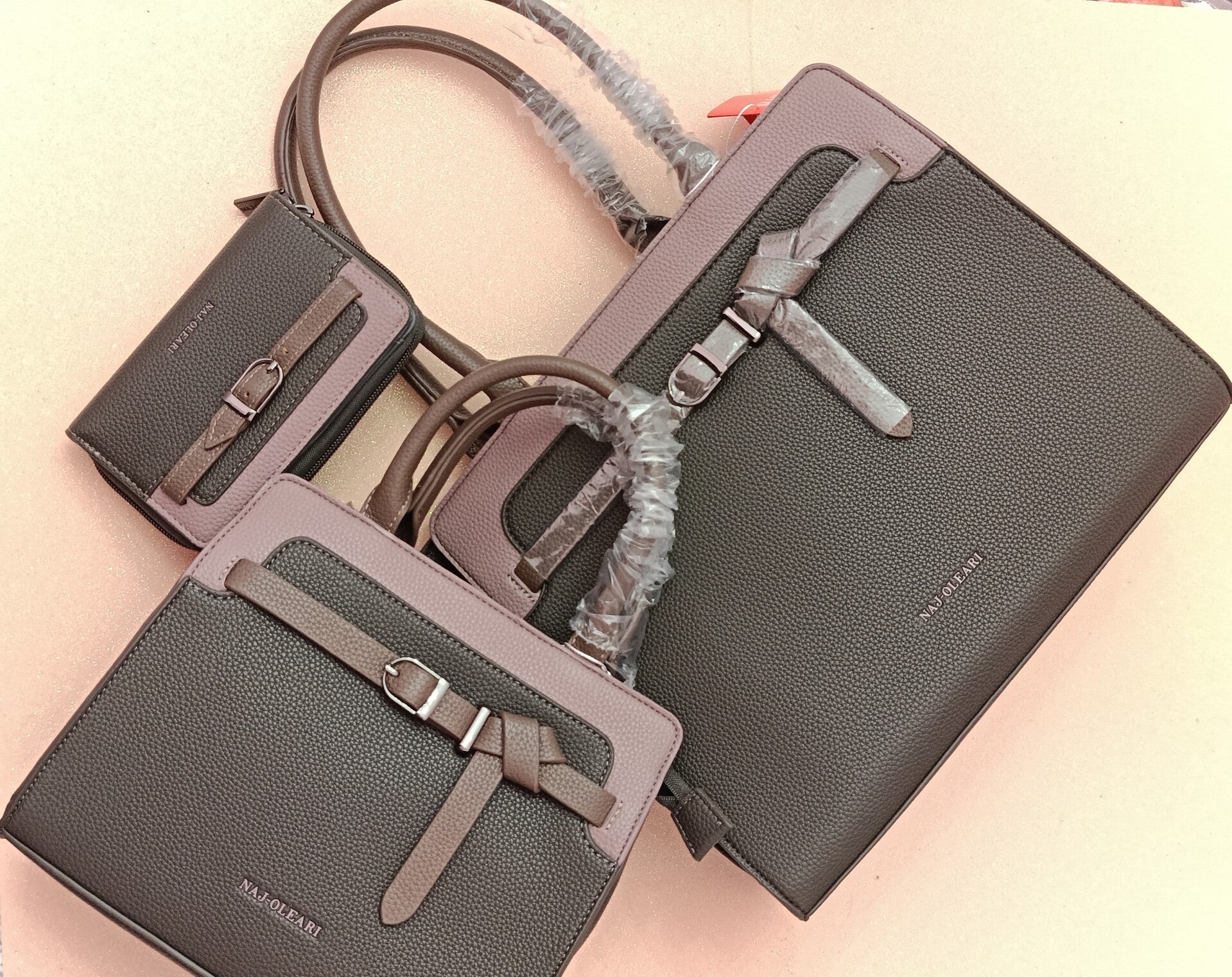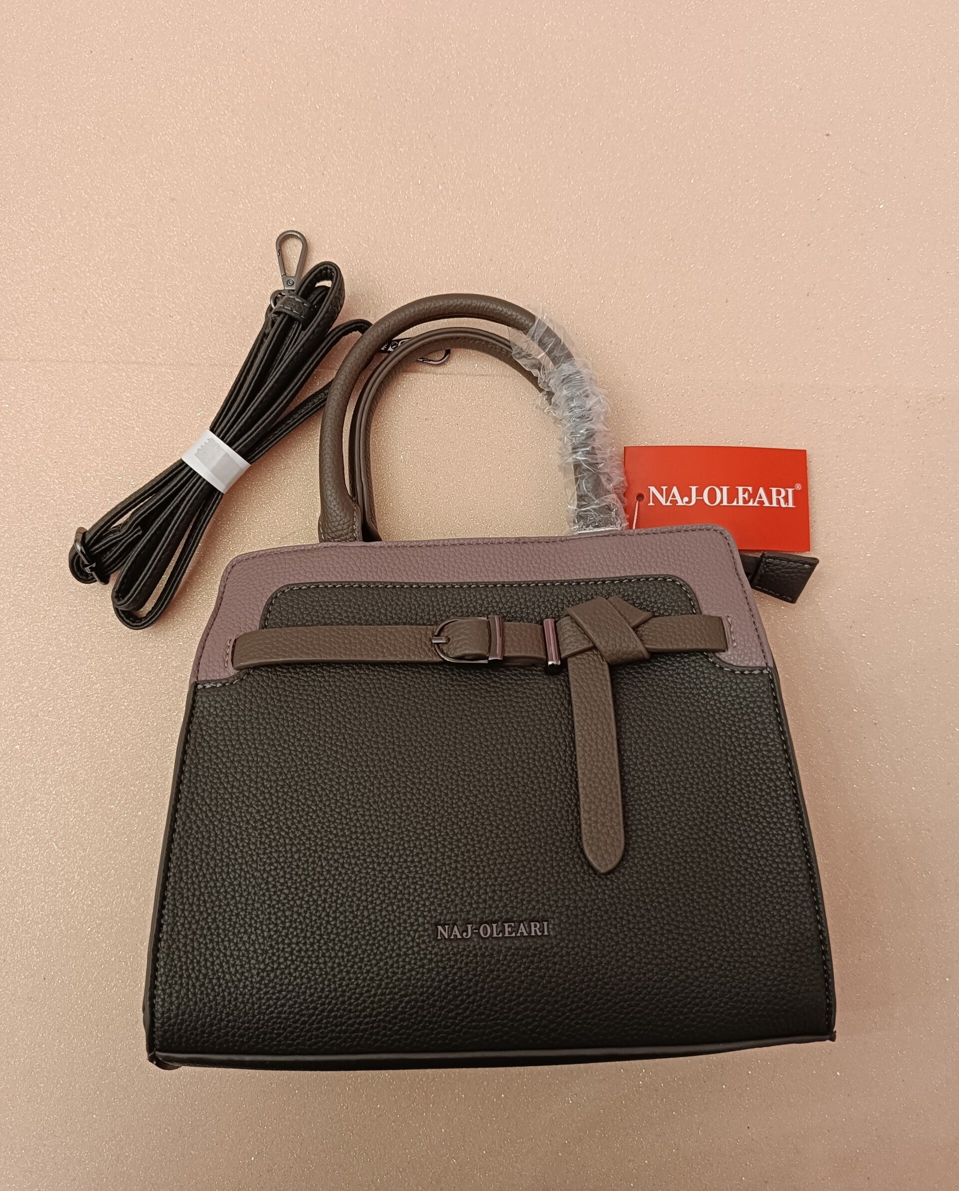 Borsa da donna misura M in vera pelle che vi donerà un look elegante. La particolarità è nel contrasto di colori; infatti è di colore tortora poi c'è la cinta come decorazione più chiara e la parte che evidenzia la linea della borsa di colore rosa.Inoltre è dotata anche da una tracolla.Questa borsa si può avere anche nella misura L e volendo c'è anche il portafoglio.