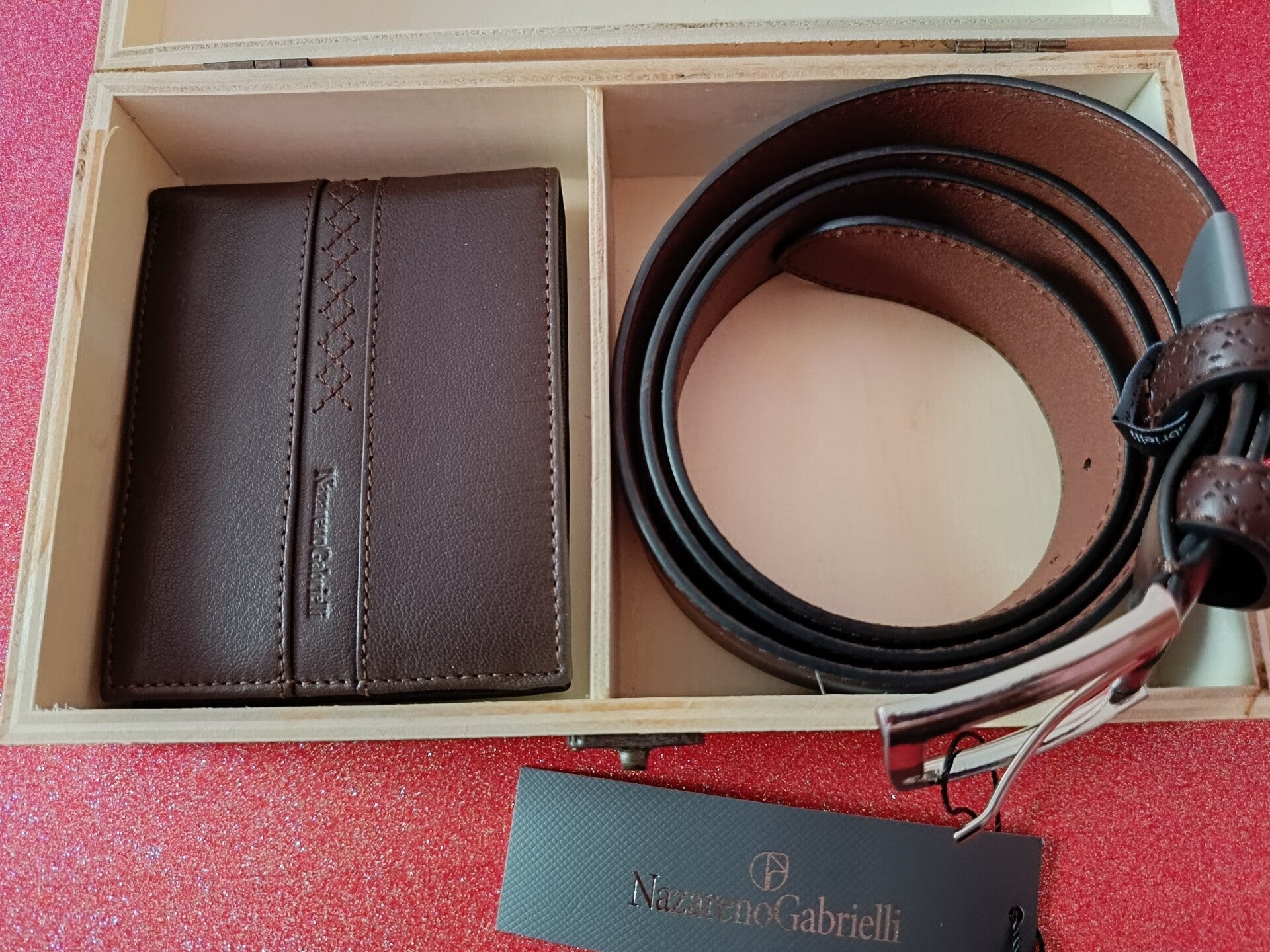 Set da uomo completo di cinta e portafoglio in vera pelle di colore marrone. È ottimo anche come idea regalo perché vi arriverà con questo bellissimo scrigno in legno. Oltre alla versione marrone c'è la variante di colore nero.