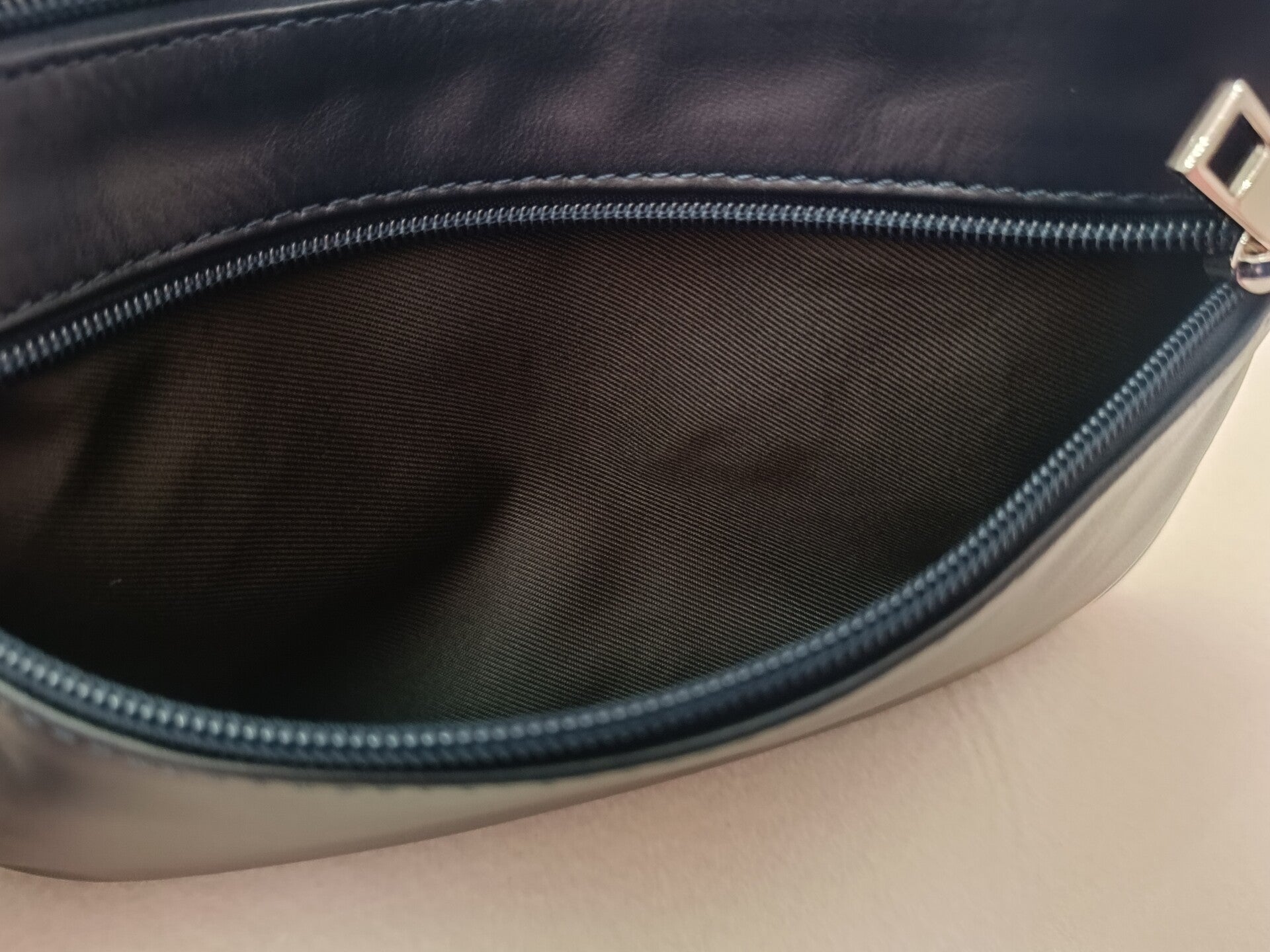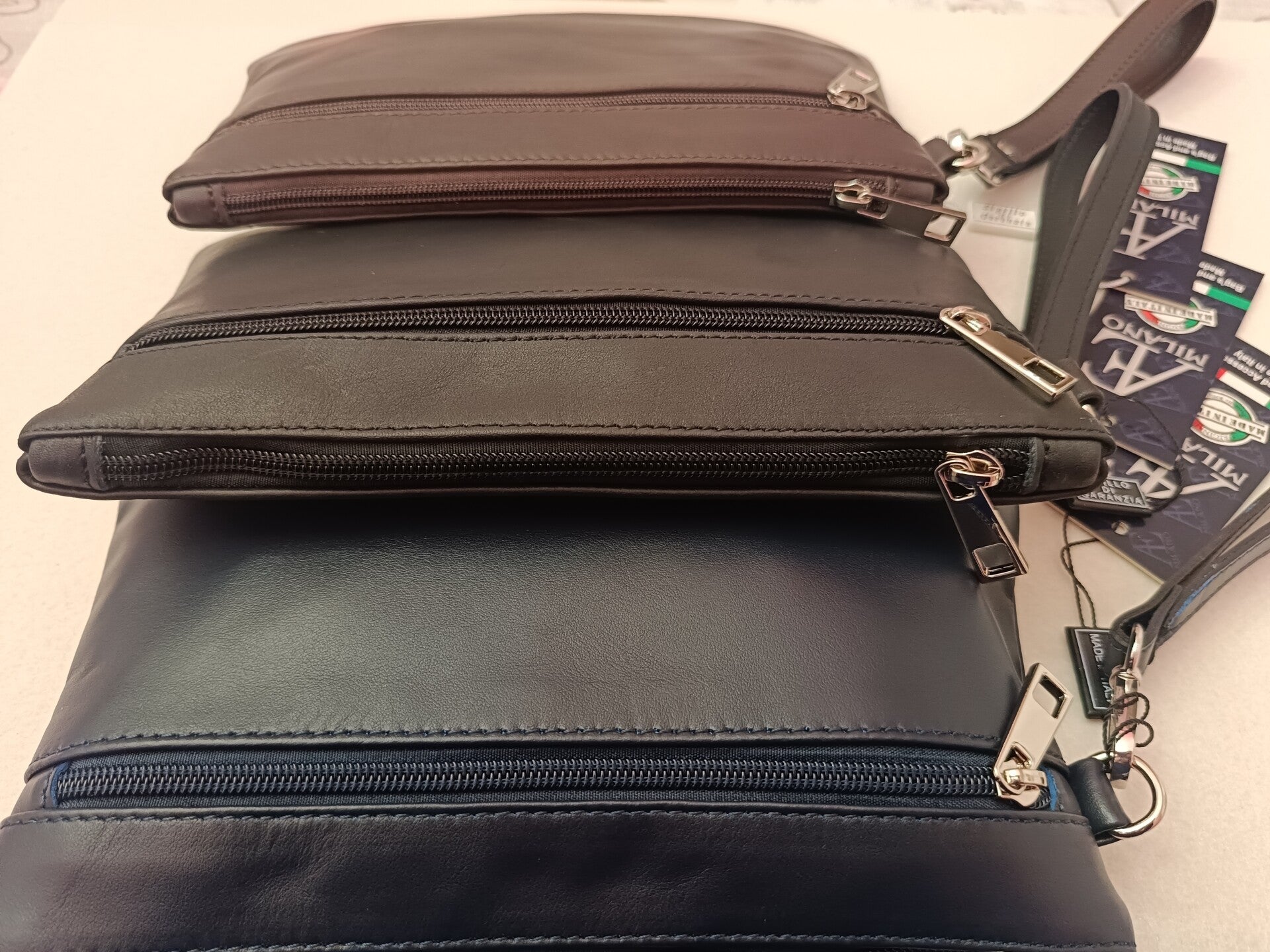 Pochette made in Italy a forma piatta da uomo in vera pelle di colore blu notte. È una pochette spaziosa perché è dotata di due cerniere. È possibile averla anche di colore nero e marrone come potete osservare dalle foto.
