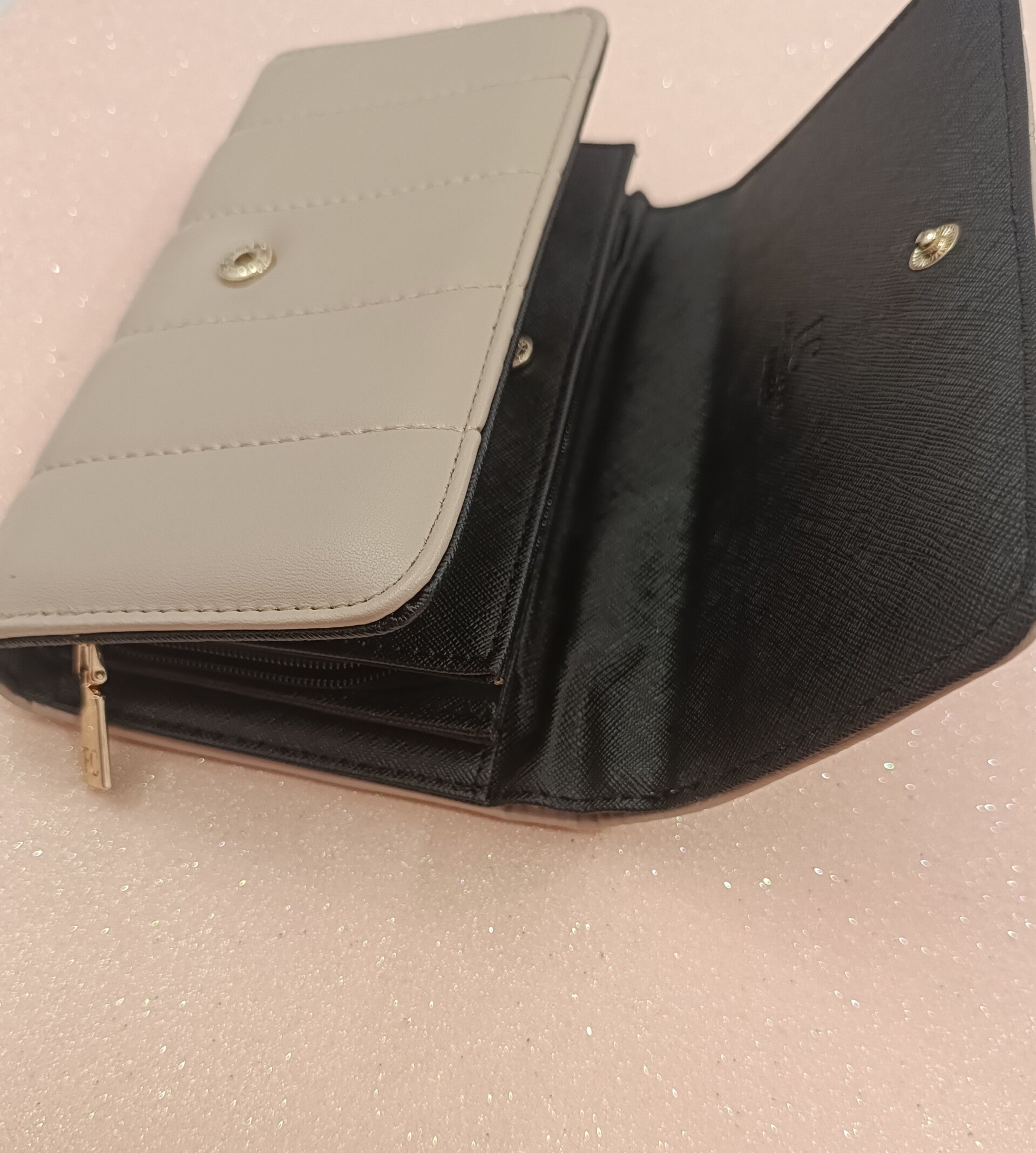 Portafoglio da donna di colore naturale con dettaglio di colore oro lucido. Questo portafoglio è molto spazioso perché ha un'ampia parte sia per mettere le vostre carte che le vostre banconote,ed ha la parte centrale con la cerniera per inserire le monete.Della stessa linea si può avere la variante di colore rubino.