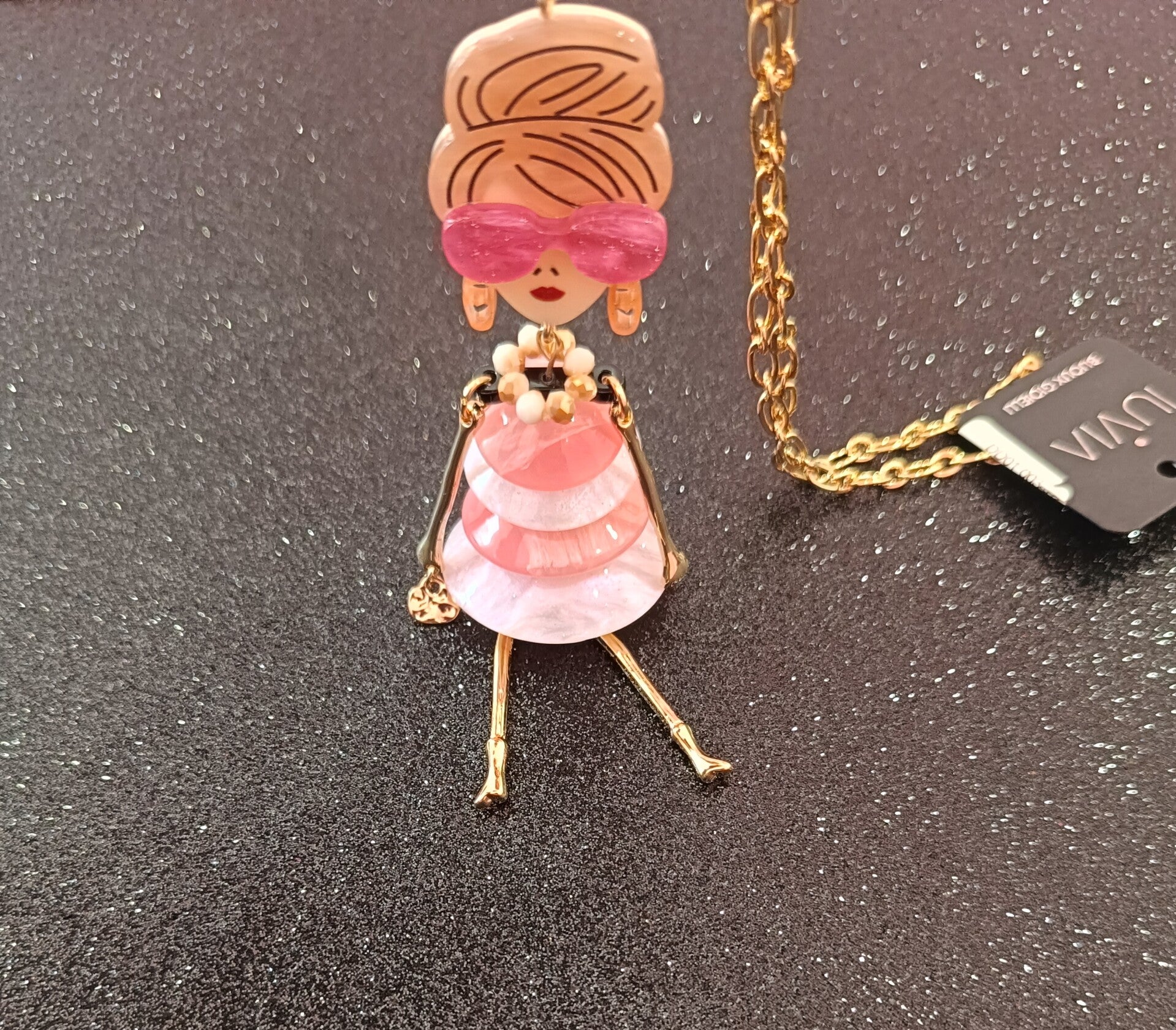 Collana con bambolina fashion di colore rosa.Questa bambolina ha degli effetti madreperla sia sugli occhiali da sole che sul vestito.Ci sono dei dettagli di colore oro come la borsa che porta la bambola,le gambe e le braccia. Porta anche gli orecchini pendenti e una collana super luminosa. Se state cercando qualcosa di diverso questa collana vi aspetta. Ci sono altre bamboline di diverso colore come potete vedere dalle foto.