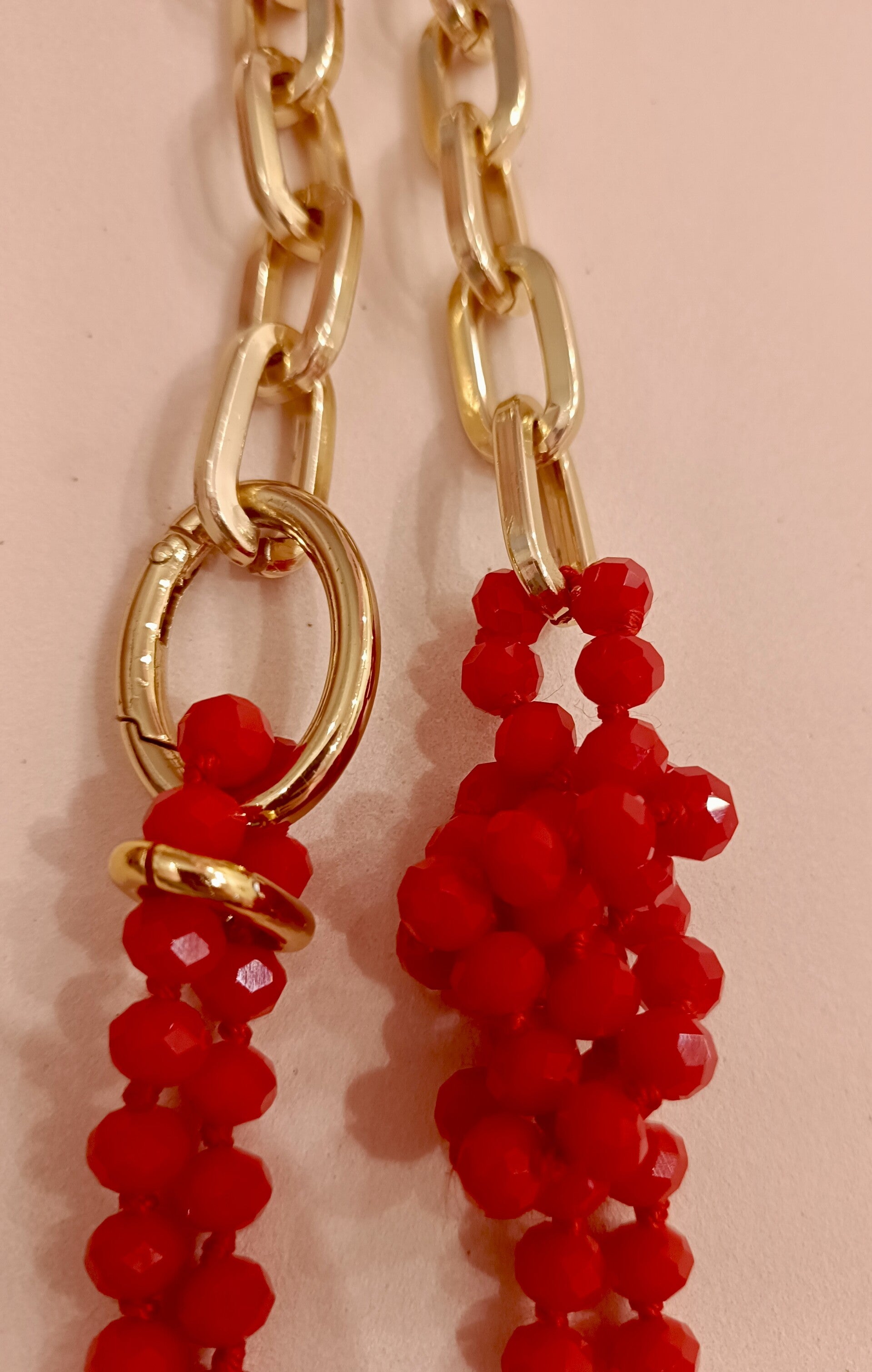 Collana con metà parte fatta da coralli di colore rosso moto luminosi e dall' altra parte da una catena di colore oro lucido. Oltre ai coralli rossi ci sono anche in altre varianti di colore come potete vedere dalle foto.
