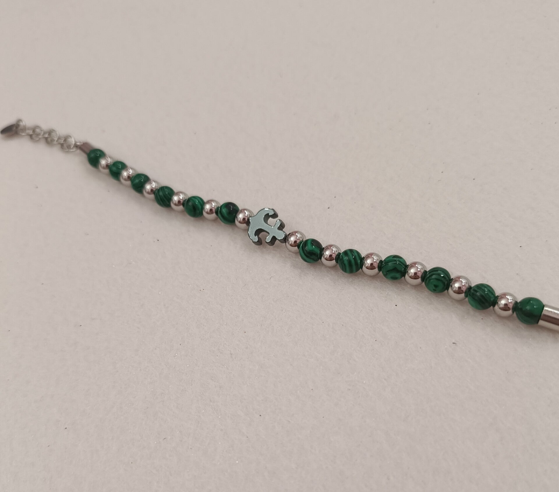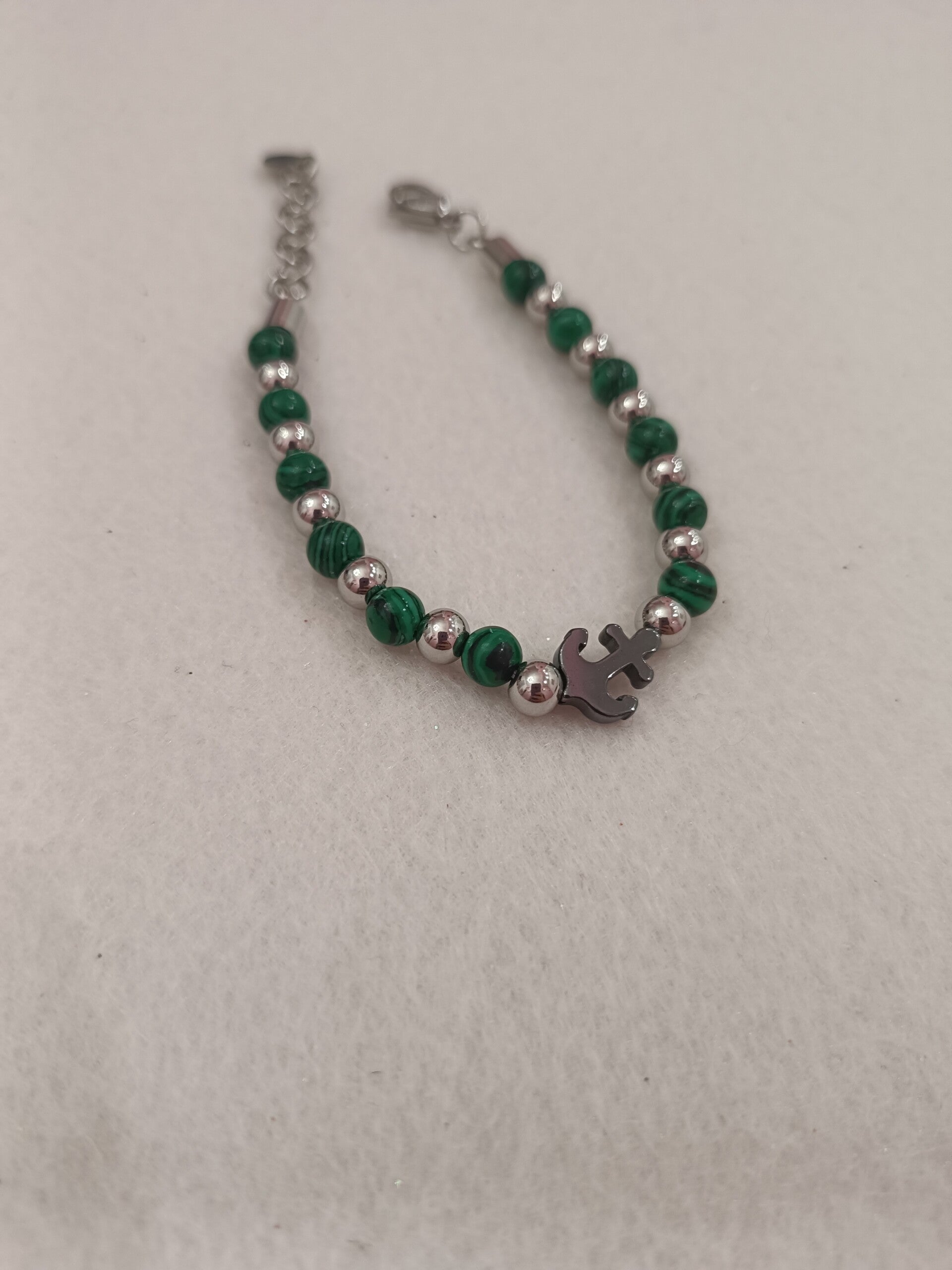 Bracciale da uomo in acciaio con dei coralli variopinti di verde e nero che si alternano a delle sfere in acciaio lucido. Al centro del bracciale c'è l 'ancora in acciaio di colore fumé lucido.