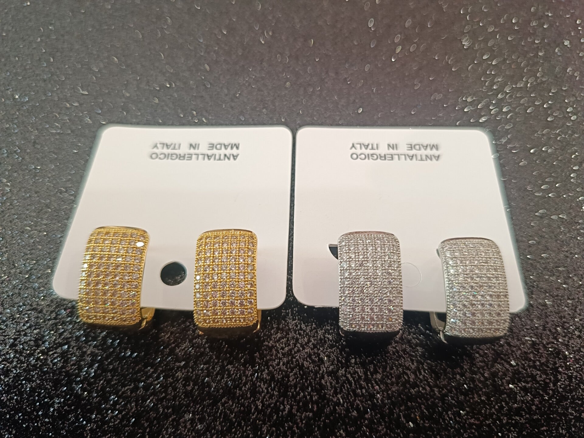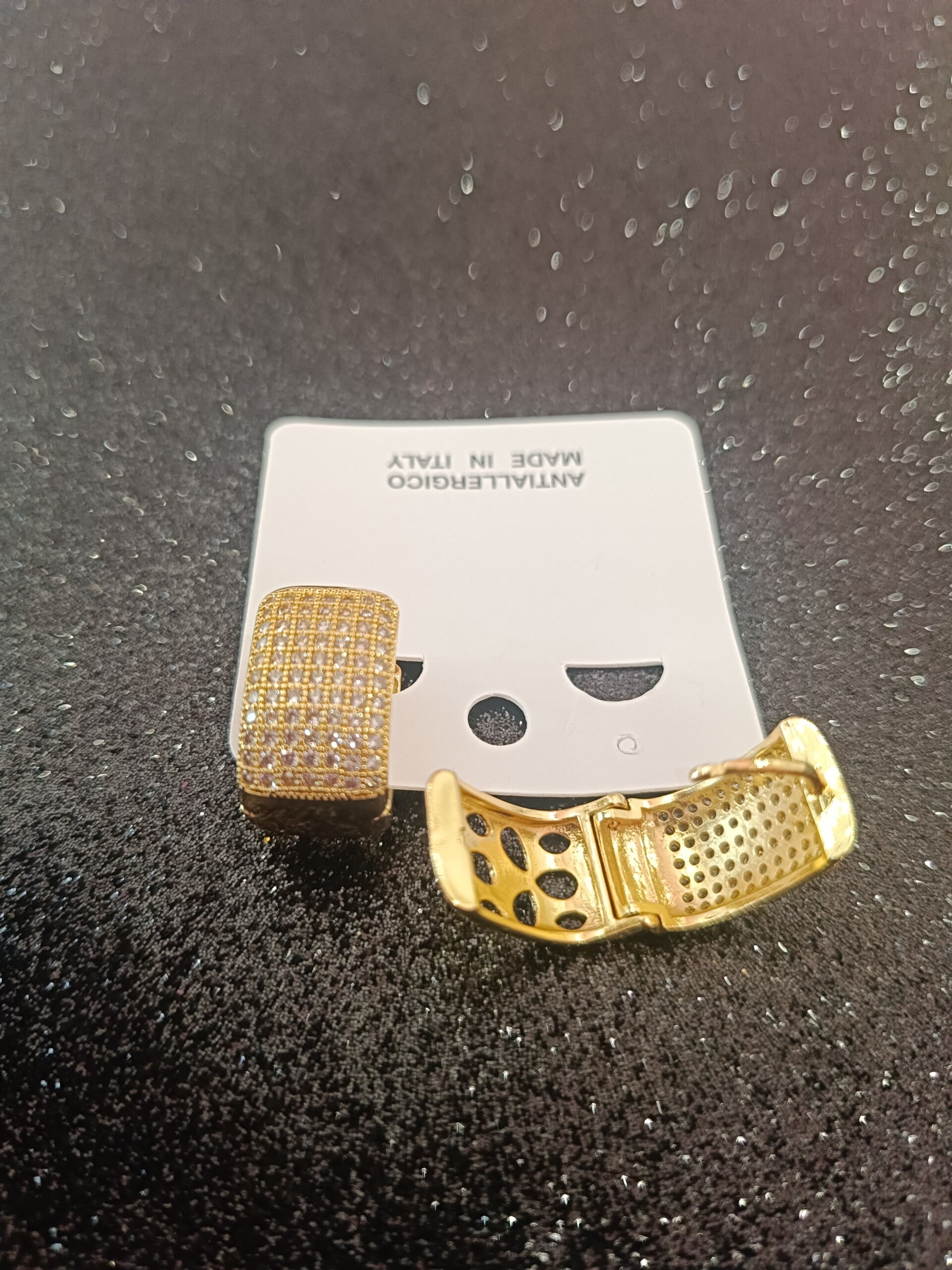 Orecchini raffinati per la loro semplicità ma allo stesso tempo vi doneranno tanta luce perché sono composti da tanti brillantini che risplendono su una base di colore oro.Inoltre sono molto pratici per la loro facilità di apertura e chiusura.Dello stesso modello c'è anche di colore silver come potete vedere dalla foto.