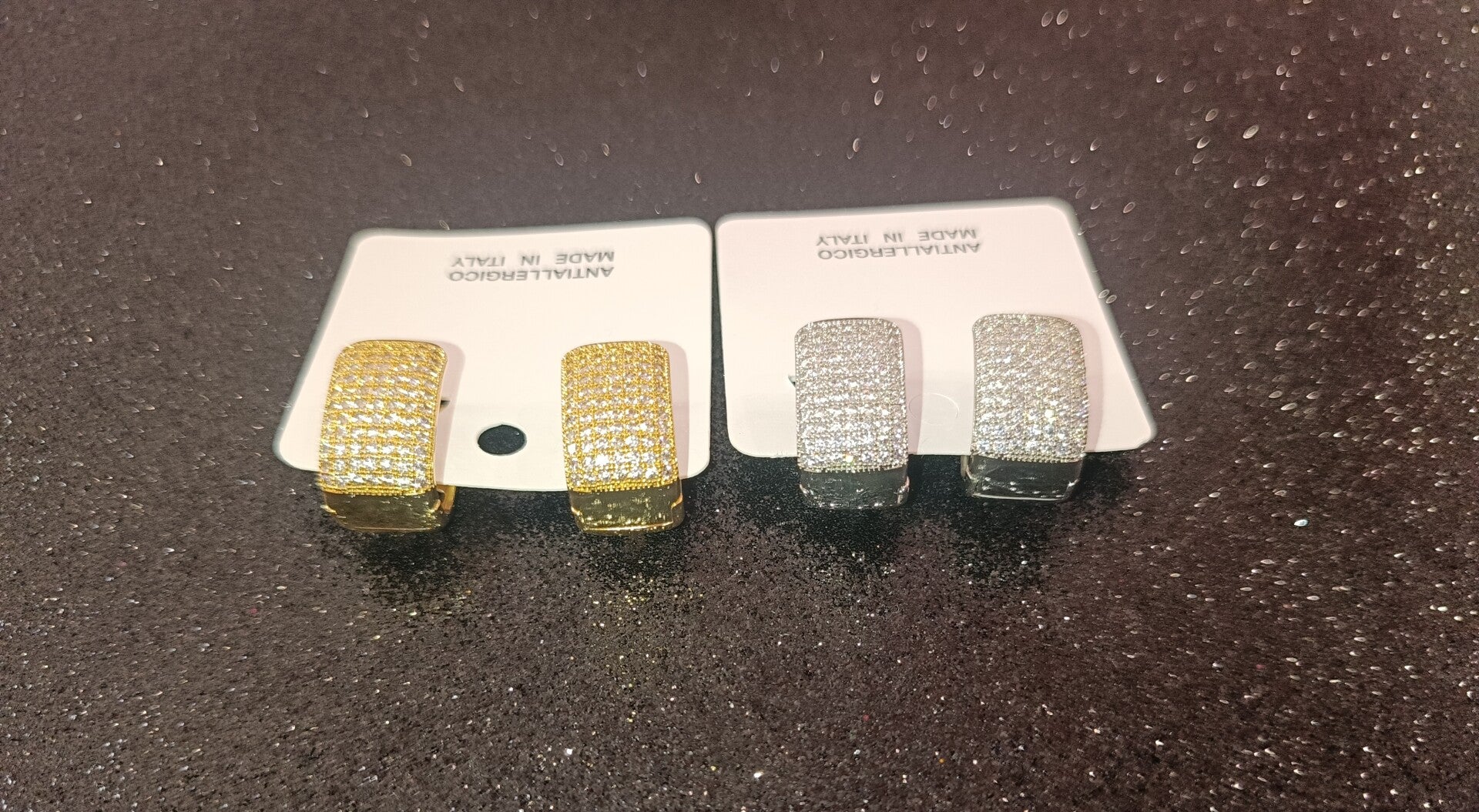 Orecchini raffinati per la loro semplicità ma allo stesso tempo vi doneranno tanta luce perché sono composti da tanti brillantini che risplendono su una base di colore silver.Inoltre sono molto pratici per la loro facilità di apertura e chiusura.Dello stesso modello c'è anche di colore oro come potete vedere dalla foto.