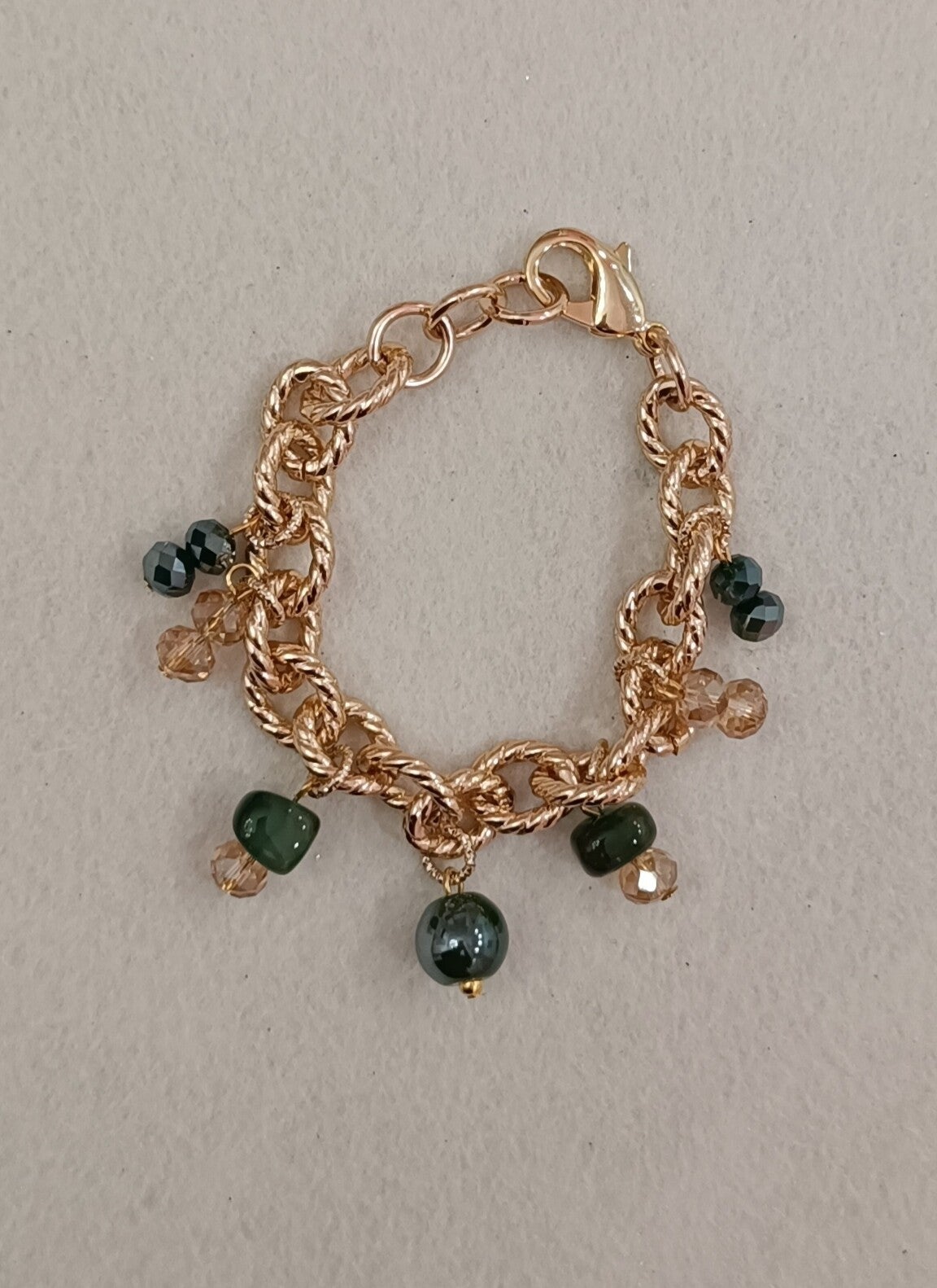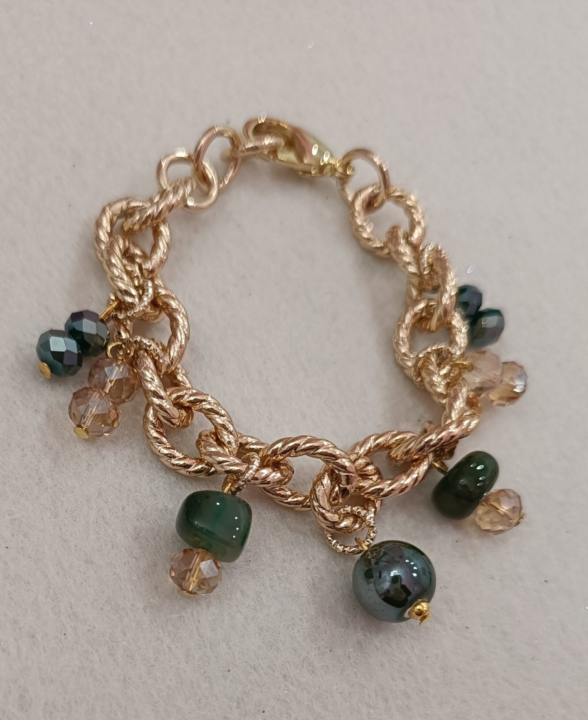 Bracciale a catena di colore oro con varie pietre, perle e corallini trasparenti che riflettendo la luce creano dei giochi di luce rendendolo luminoso. È stato creato quindi è un pezzo unico ed è made in Italy.