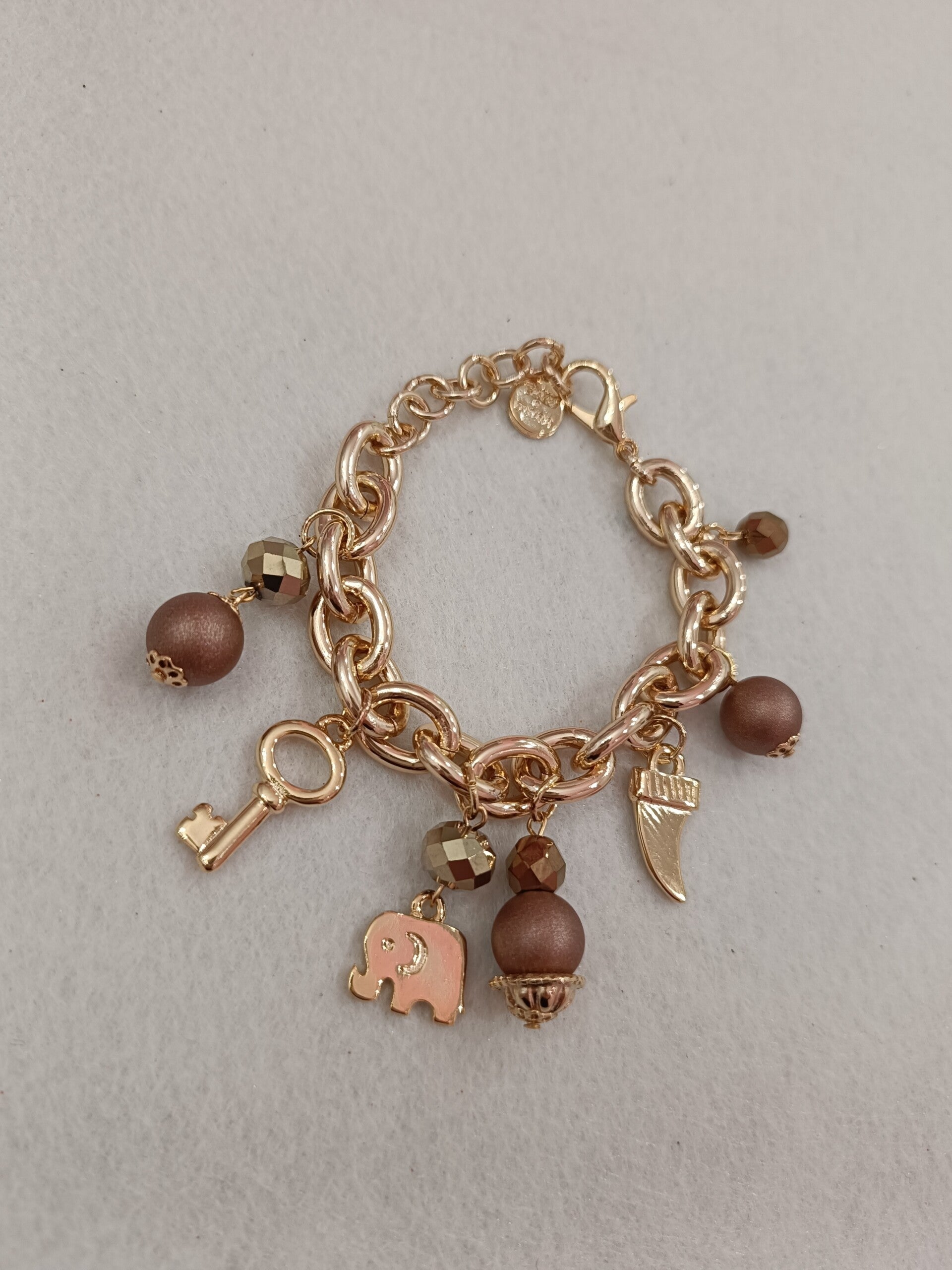 Bracciale a catena di colore oro con varie perle e corallini di colore marrone chiaro e dei charms portafortuna che lo rendono particolare. Questo modello si può avere anche di colore rosso e verde come potete vedere in foto.