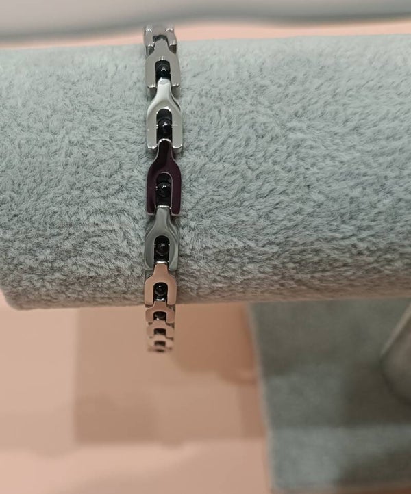 Bracciale in acciaio, all' interno del modellino ci sono delle piccole sfere di colore nero che lo rendono particolare. Questo bracciale è dotato da una pratica chiusura. Dello stesso modello sì può acquistare anche la versione blu elettrico e oro come potete osservare dalle foto.