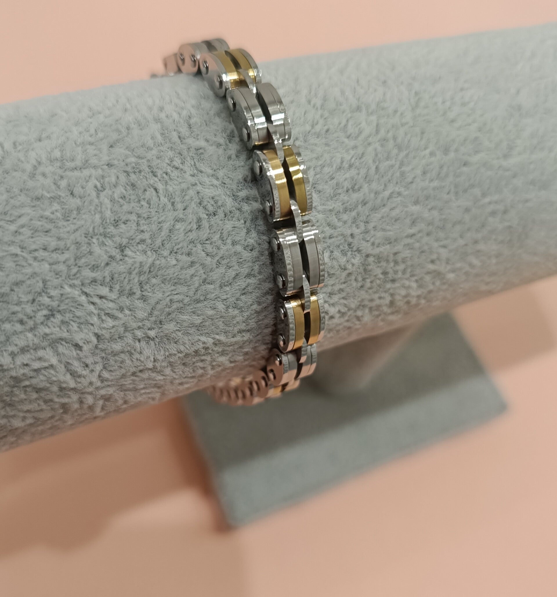 Bracciale in acciaio a catena, alternato dai colori Silver e Gold che lo rendono particolare. Questo bracciale oltre ad essere bello è anche pratico perché dotato da una comoda chiusura.