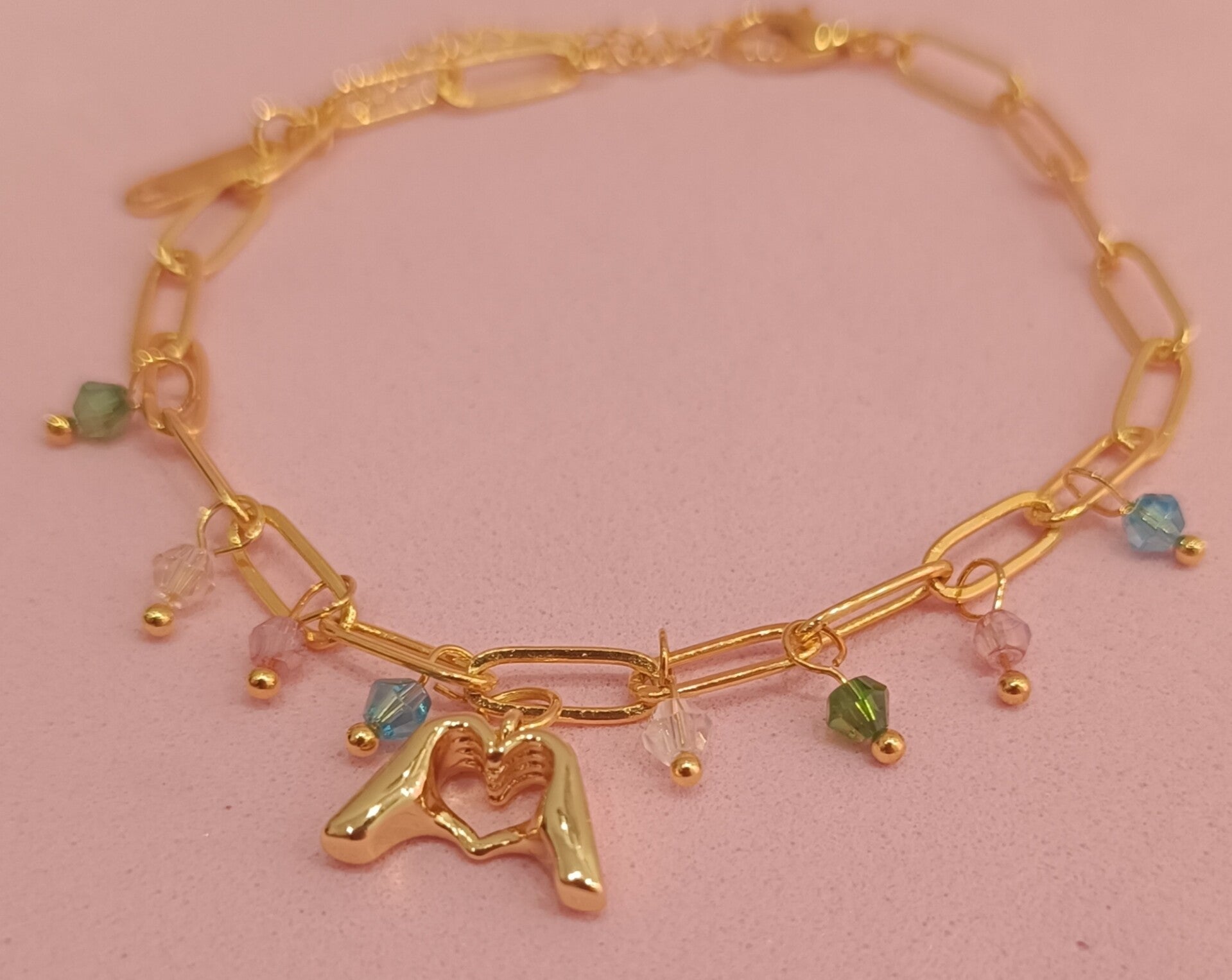 Esclusivo bracciale in acciaio placcato in oro lucido realizzato a mano. Questo bracciale è composto da un charms con le mani che formano un cuore e tanti mini corallini luminosi e colorati. Della stessa linea esiste anche un' altra versione come potete osservare dalla foto sono solo due pezzi esclusivi.