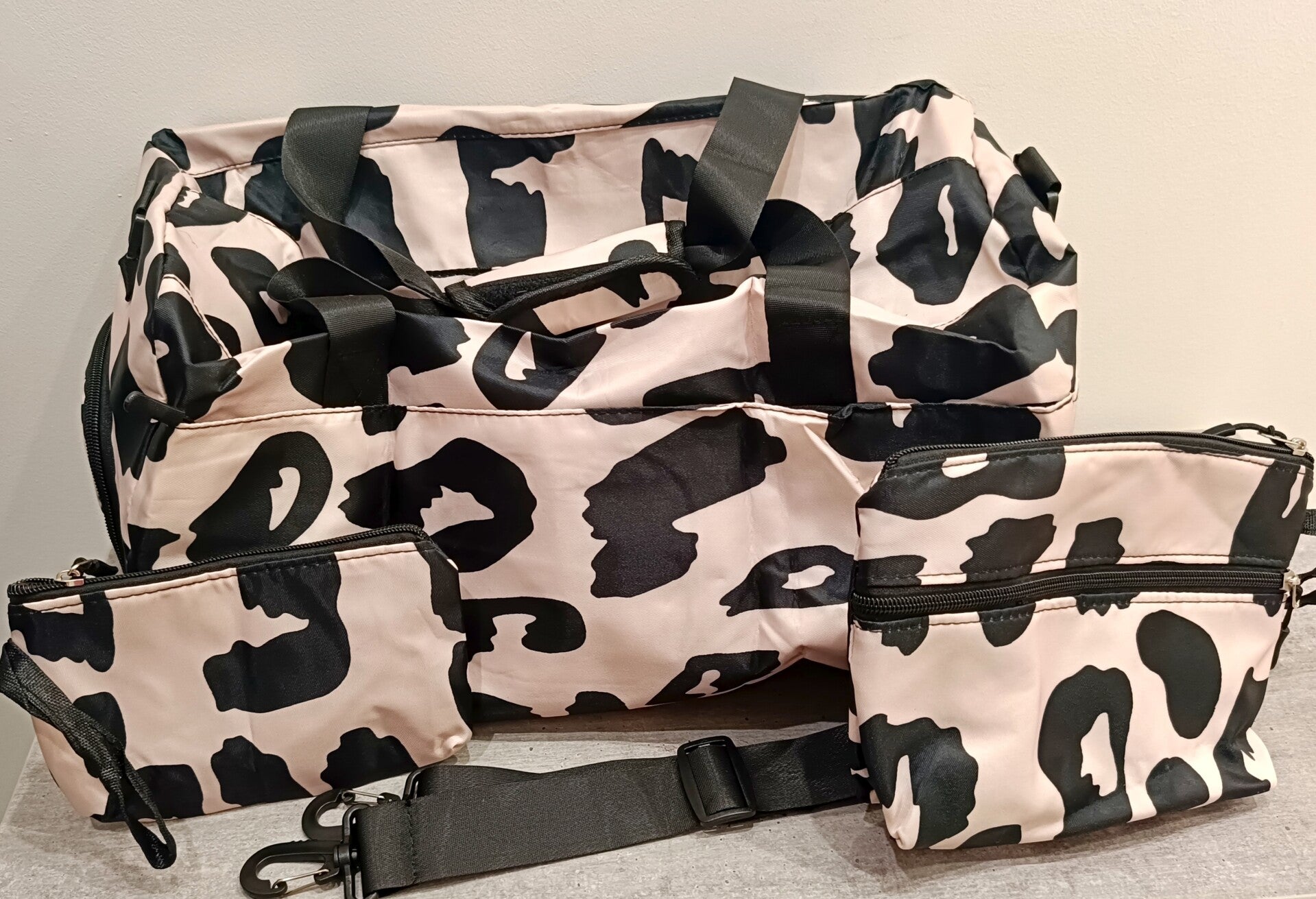 Set composto da tre pezzi di colore champagne con stampa maculata nera. Questo set è composto da un borsone ampio con un beauty case e un pratico borsellino, inoltre ha due tasche laterali in una è possibile inserire anche le scarpe perché è composto da una fodera ulteriore che non si unisce alla fodera principale.Inoltre ha una tasca anteriore spaziosa e plastificata che può essere tranquillamente lavabile. Anche il beauty case e il borsellino sono molto capienti. Questo borsone si può acquistare anche nella variante di colore rosa come potete osservare dalla foto.