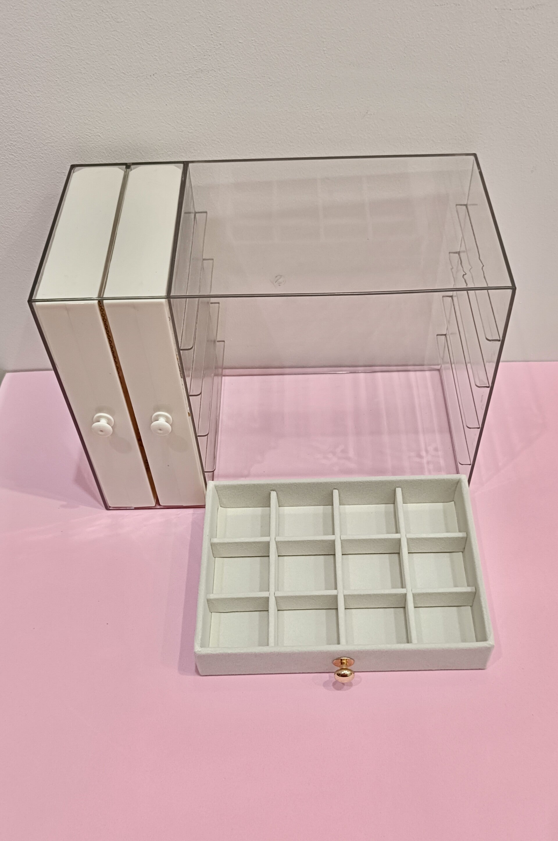 Portagioielli in tessuto morbido di colore beige con pomelli di colore oro. Questo portagioielli è molto comodo perché composto da due cassetti verticali dove si possono inserire le collane senza farle rovinare visto che ognuna può avere il suo giusto spazio. Inoltre ci sono ben cinque cassetti spaziosi di cui uno è libero da i divisori mentre gli altri cassetti sono con i divisori ma comunque possono essere regolati o tolti in base alle vostre preferenze. Se volete un portagioielli più piccolo con tre cassetti ma comunque spaziosi c'è la possibilità di poterlo acquistare nel colore champagne come potete osservare dalla foto.