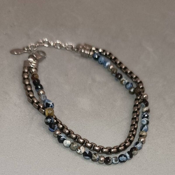 Bracciale composto da una parte con la catena in acciaio e l 'altra parte è adornata da tanti corallini di colore variopinto sulle sfumature del blu, marrone e panna. Della stessa linea c'è il bracciale con i coralli turchese e su alcune zone ci sono le sfumature effetto marmo di colore oro, come potete osservare dalla foto.