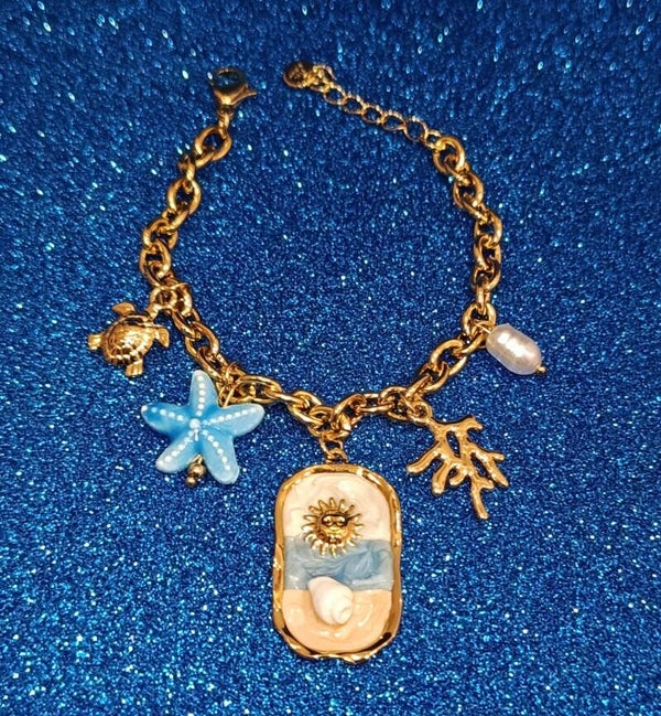Bracciale in acciaio con catenina di colore Gold, impreziosito sui lati da charms tema mare come: il corallo, la perla, la stella marina e una simpatica tartaruga. Nella parte centrale c'è un charms dipinto che crea degli effetti madreperlati stupendi, con un sole e una conchiglia in rilievo.
